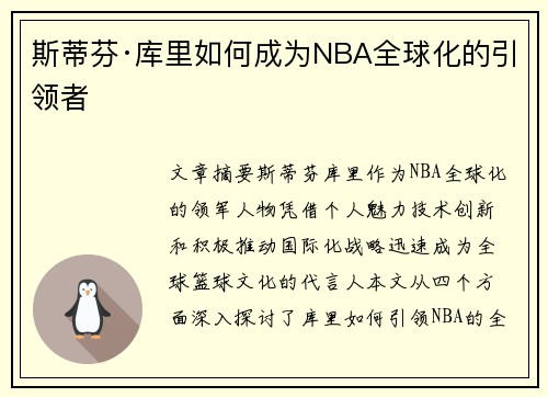 文章摘要:斯蒂芬·库里作为NBA全球化的领军人物,凭借个人魅力、技术创新和积极推动国际化战略,迅速成为全球篮球文化的代言人。本文从四个方面深入探讨了库里如何引领NBA的全球化进程。首先,库里突破传统篮球打法的创新成为全球篮球爱好者的关注焦点。其次,库里在国际市场的品牌效应与广告代言能力,极大增强了NBA的国际影响力。第三,库里在NBA赛事与其他篮球文化交流活动中的贡献,不仅加强了跨文化互动,还推动了NBA在全球的普及。最后,库里如何通过社交媒体和个人形象的塑造,拓宽了全球粉丝基础,促进了NBA与世界其他地区的紧密联系。本文通过具体案例和数据分析,揭示了库里如何成为全球篮球运动的重要推动者。值得关注的是,库里不仅在场内外取得卓越成就,还通过其独特的个人魅力在全球篮球文化中留下了深刻印记。